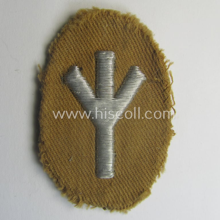 This is a truly attractive - and actually rarely encountered! - neatly hand-embroidered, SA- (ie. 'Sturmabteilungen'-) related officers'-type armbadge (ie. 'Ärmelabzeichen für Führer') as was executed in silver-coloured braid on a typical bright-brown-coloured (and linnen-based) background as was intended for an: 'SA-Führer' (ie. 'Feldscher o. Arzt') and that comes in an overall nice- (ie. I deem possibly used- and/or once shirt- ie. tunic-attached-), condition. The nicely executed, oval-shaped insignia-piece is only sized: 5,7 x 3,8 cms. does still retains its (period!) paper-based, so-called: 'RzM'-etiket in place. Simply an attractive - and actually rarely encountered! - SA- (ie. 'Sturmabteilungen'-) related armbadge ie. 'Ärmelabzeichen für Führer'!