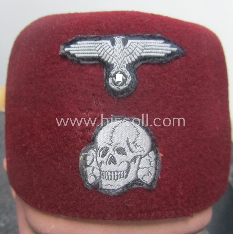 Superb, maroon-red-coloured, Waffen-SS-pattern so-called: 'Fez' having a neat - and fully matching! - silver-grey-coloured- and/or 'BeVo'-woven insignia-set originally- (ie. 'off-factory'-) attached