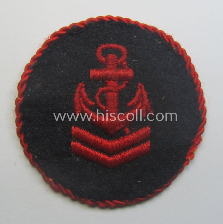 This is a neat - and actually quite scarcely encountered! - so-called: Marine-HJ (ie. 'Marine-Hitlerjugend') arm-badge aka: 'Ärmelabzeichen Reichs-Seefunkprüfung B' (or: naval-HJ radio-proficiency badge of the medium ie. 'B'-grade) and that comes in an overall nicely preserved- (I deem just mimimally used- and/or tunic-removed-), condition. The neat (circular-shaped) badge - which is excuted in bright-red-toned linnen onto a darker-blue coloured- and woolen-based background - is piped with a red-coloured, twisted 'cord' as per regulation. The badge depicts a machine embroidered (ie. bright-red-coloured anchor-device with below a double 'chevron' denoting that it deals with an insignia-piece of the medium- (ie. 'B'-) grade). The badge is void of an 'RzM'-etiket (which might have been lost over the years) and is just a tiny bit stained caused by years of storage only. The piece is neatly backed with a piece of black-toned linnen as more often. Simply a very nice - and actually unusually encountered! - Marine-HJ 'signals-related' insignia-piece!