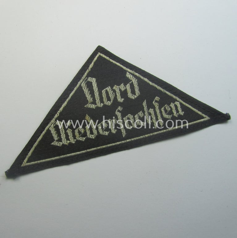 'HJ' ('Hitlerjugend') ie. 'BDM' ('Bund Deutscher Mädel'-) district-triangle (ie. 'Gebietsdreieck') entitled: 'Nord Niedersachsen' being a moderately used- ie. worn example