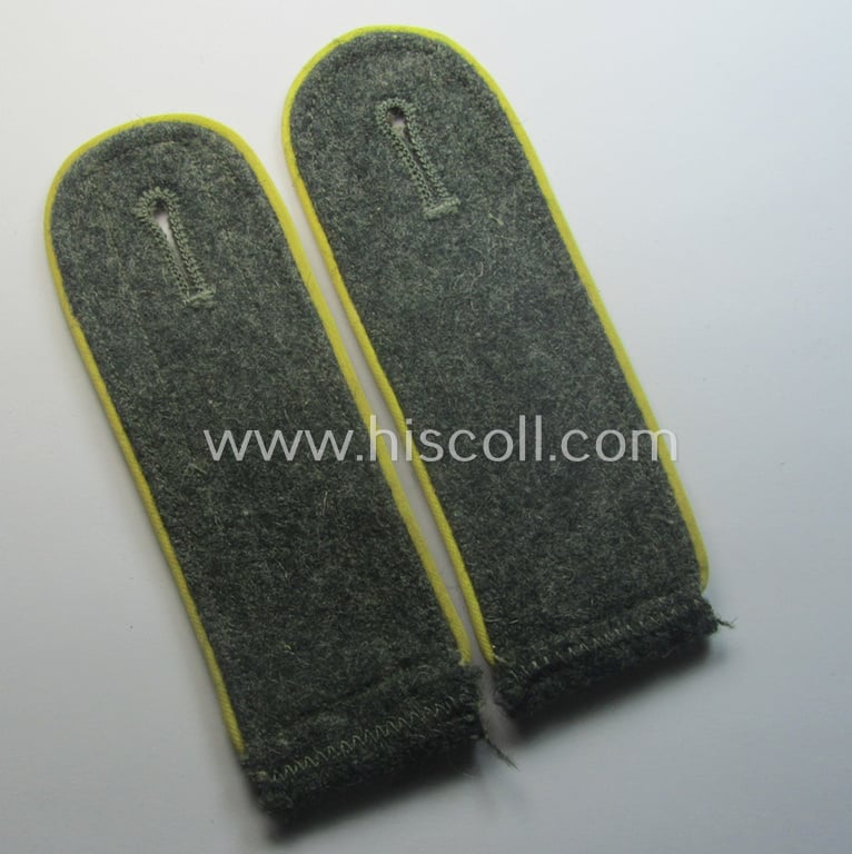 This is an attractive - just moderately used and/or fully matching! - pair of later-war-period, WH (Heeres) so-called: 'M44'-styled, 'simplified', enlisted-mens'-type shoulderstraps as was piped in the neat bright-yellow- (ie. 'zitronengelber'-) coloured branchcolour as was intended for - and used by! - a: 'Soldat der Nachrichten-Truppen' (or: simple soldier who served within a later-war-period, army signals'-regiment) and that comes in an overall very nice- (ie. hardly used- nor worn-), condition. The straps - which are approximately 11 cms. sized in length each as more often - have the 'standard-pattern'- and/or typical, field-grey-coloured and/or woolen-based 'upperdecks' (which are executed in so-called: Italian wool-styled aka 'drap Orti') and/or typical tongues and do show the bright-yellow- (ie. 'zitronengelber'-) coloured and/or: 'silk-like'-type branchcolour (ie. piping) attached. The straps are constructed following the typical '1944 cloth-minimising production-manner' using different shades of wool and/or material (as can be seen on the pictures). The straps show some minimal age, wear and/or staining simply caused by minimal wear and/or decades of storage. It should be noted that all 'M44'-style, EM-pattern shoulderstraps are actually quite hard to encounter and can easily be graded 'scarce': even more so when they come in a truly used- and/or worn condition. Simply a nice occasion to acquire an attractive - and fully 'text-book'! - M44-styled, enlisted-mens'-type shoulderstrap-pair as was intended for usage by a: 'Soldat der Nachrichten-Truppen': great to complete any later-war M44- (ie. even M43-) model 'Heeres'-tunic!