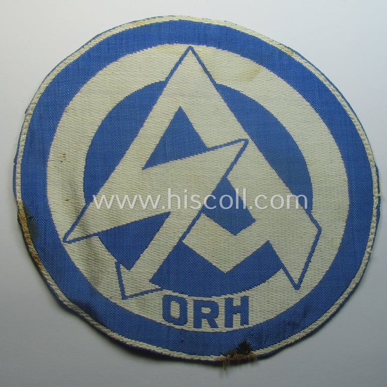 This is a decorative - and actually scarcely encountered! - SA (ie. 'Sturmabteilungen'), typical 'BeVo'-woven sport-shirt insignia (of the third ie. final type) as was specifically intended for an SA-member who served within the: 'SA-Gruppe Oberrhein' (ie. 'ORH') and that comes in overall nice- (I deem simply never used- nor shirt-attached-), condition. The fairly large-sized- badge (having a diameter of approximately 14 cms.) is woven in light-blue-coloured linnen onto a white-coloured (and also linnen-based) background (being as stated above the branchcolour of the: 'SA-Gruppe Oberrhein' and shows simply no wear nor age (it does show some minimal rust-stains but can I deem neverthess be still graded as 'mint- ie. unissued'). This particular example misses its (once surely present) so-called: 'RzM'-etiket: some minimal remains are still noticable (as can be seen on the pictures). Simply an attractive - and unusually encountered! - piece of SA-related sport-shirt insignia that comes not that often for sale!