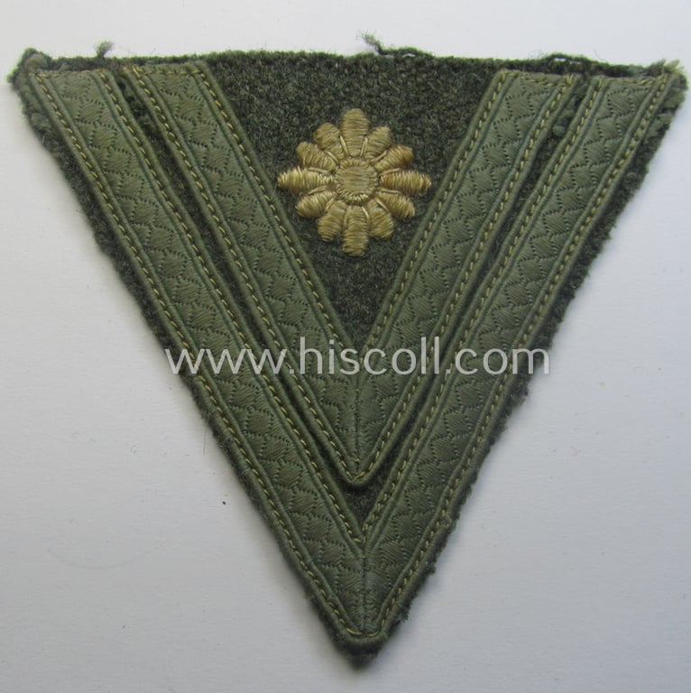 This is an attractive - and just moderately used- ie. worn! - example of a WH (Heeres) 'Armwinkel' (ie.: arm-chevron) as was executed on a typical, field-grey-coloured- and/or woolen-based background as was intended for usage by a soldier with the - unusually encountered! - rank of: 'Stabsgefreiter' (ie. senior-private) and that comes in an overall very nice- (and I deem just moderately used- and/or worn-), condition. The chevron is neatly executed and shows a detailed, machine-embroidered- (and white-coloured) 'star' whereunder a double-stripe of (typical) bluish-grey-coloured- (ie. 'sub-dued') and/or 'standard'-pattern NCO-braid can be observed. The piece is void of an additional 'backing' as is more often observed (as can be seen on the pictures). It sounds maybe strange but these 'simple' Heeres-related rank-insignia are quite hard to encounter. Simply an attractive - and unsually found! - WH-rank-badge that is I deem accordingly priced!