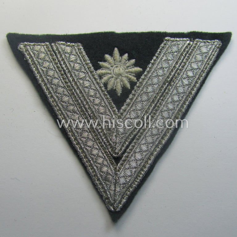 This is an attractive - and I deem never used- nor worn! - example of a WH (Heeres) 'Armwinkel' (ie.: arm-chevron) as was executed on a typical, darker-green-coloured- and/or woolen-based background as was intended for usage by a soldier with the - unusually encountered! - rank of: 'Stabsgefreiter' (ie. senior-private) and that comes in an overall very nice- (and I deem never used- nor worn- ie. still 'virtually mint'-), condition. The chevron is neatly executed and shows a detailed, machine-embroidered- (and white-coloured) 'star' whereunder a double-stripe of (typical) silverish-coloured- (ie. non-'sub-dued') and/or 'standard'-pattern NCO-braid can be observed. The piece is not additionally 'backed' as is more often observed (as can be seen on the pictures). It sounds maybe strange but these 'simple' Heeres-related rank-insignia are quite hard to encounter. Simply a very attractive - and actually unusually found! - WH-rank-badge that is I deem accordingly priced!
