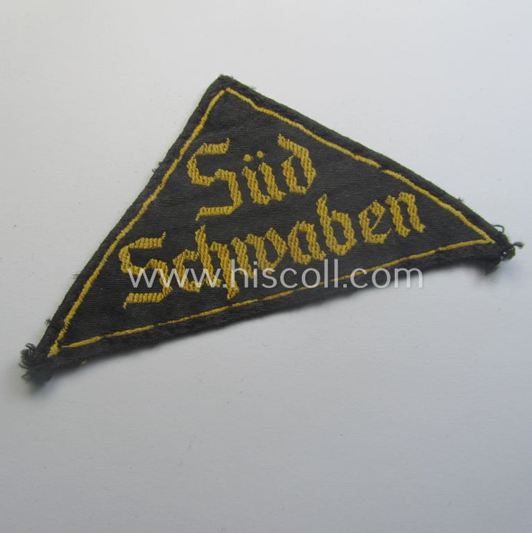 Truly used and/or worn 'HJ' ('Hitlerjugend') district-triangle (ie. 'Gebietsdreieck') entitled: 'Süd Schwaben'