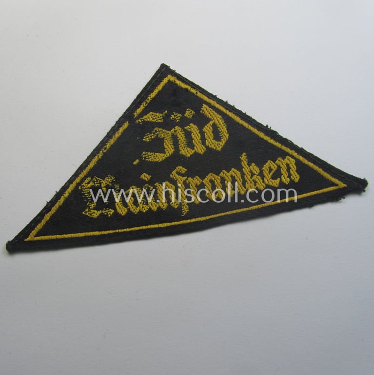 Truly used and/or worn 'HJ' ('Hitlerjugend') district-triangle (ie. 'Gebietsdreieck') entitled: 'Süd Mainfranken'