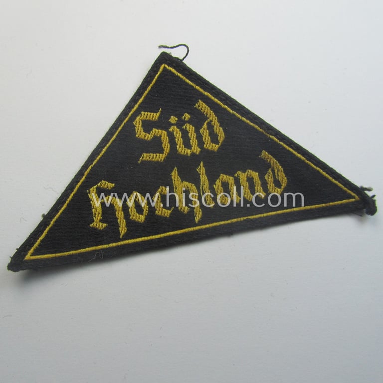 Truly used and/or worn 'HJ' ('Hitlerjugend') district-triangle (ie. 'Gebietsdreieck') entitled: 'Süd Hochland'