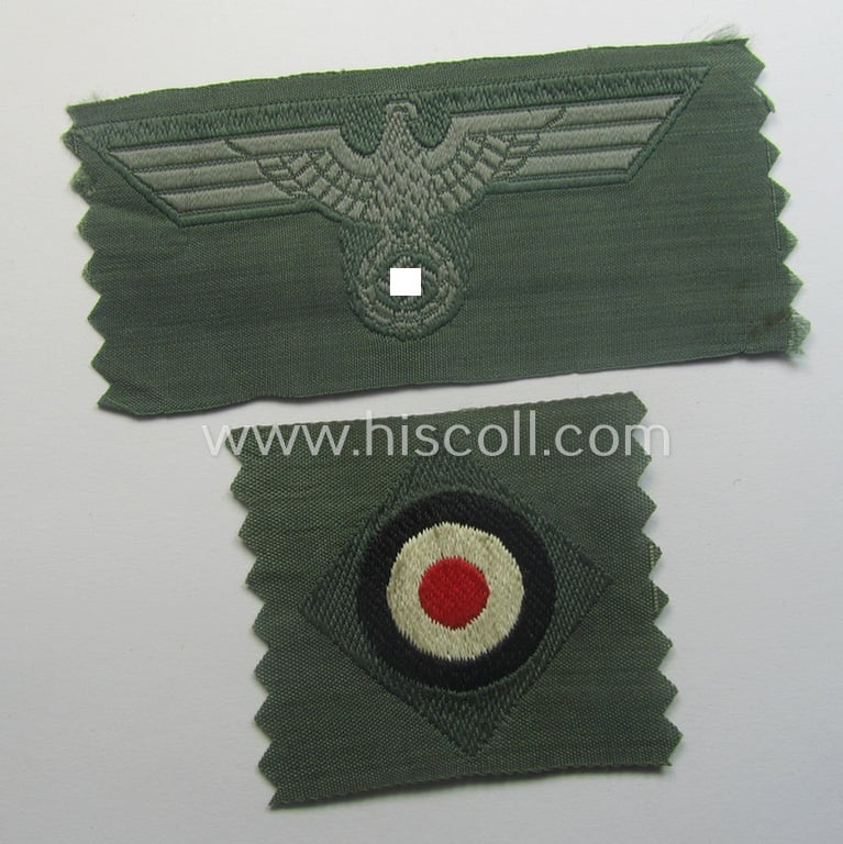 Early- (ie. mid-) war-period, WH (Heeres) cap-eagle & cocarde-set (ie. 'Schiffchenmützen-Adler u. Kokarde-Satz für Mannschaften u. Uffz.') being a 'virtually mint' set as executed in bluish-grey-coloured linnen on a field-grey-coloured background