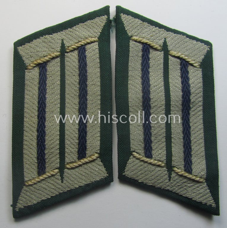 This is a very attractive - scarcely encountered and simply never worn nor used! - pair of WH (Heeres) (later-war-pattern) officers'-type collar-tabs (ie. 'Kragenspiegel für Offiziere des Heeres') as was entirely executed in the neat 'BeVo'-weave pattern and that is piped in the darker-blue- (ie. 'blauer'-) coloured branchcolour as was intended for an officer who serving within the: 'Sanitäts-Truppen'- (ie. officer who served within a medical unit) and that comes in an overall very nice- (ie. I deem simply never used- ie. 'virtually mint'- and/or I deem never tunic-attached-), condition. The neat pair - which is 'backed' with beige-coloured- and/or 'buckram'-based material as is more often observed - is just a tiny bit stained due to decades of storage and/or handling and comes as recently found. These tabs were the typical 'later-war'-version of the 'standard'- and regular-embroidered officers'-type collar-tabs. One of the tabs shows a blue-inked 'D.R.G.M.'-stamp on its back (as is more often but not always encountered) whereas the other still shows its period, inked price of 1 RM (as can be noticed on the pictures). Simply a great pair of 'Sanitäts-Truppen'-related, officers'-pattern 'Kragenspiegel' that comes in a truly wonderful condition: hard to find a nicer and more attractive pair in this desirable branchcolour for a more interesting price!