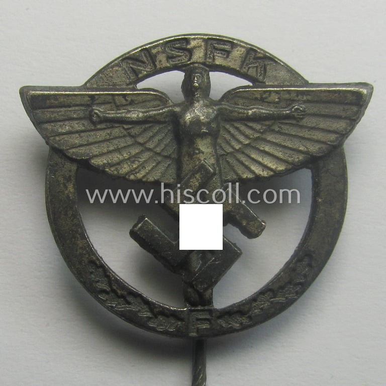 This is an attractive example of a silverish-toned- (ie. typical 'Buntmetall'-) based so-called: N.S.F.K.- (or: 'National Socialistisches Flieger Korps'-) related civil-attire, sponsoring-members'-badge (ie. 'Zivilabzeichen für förderende Mitglieder') being a clearly maker- (ie. capital 'M'-) marked example that is also bearing a patent-pending- (ie. 'Ges.Gesch.'-) designation on its back and that comes in an overall very nice- (albeit moderately used- ie. worn-), condition. The tiny badge - that depicts the N.S.F.K-logo (ie. 'fliegender Mensch') surrounded by a circle that shows a tiny 'F'-character on its bottom - comes naturally mounted onto its period longer-sized pin. The piece has most certainly never been cleaned nor polished and is a tiny bit stained ie. tarnished (as can be seen on the pictures). Simply a neat, smaller-sized 'N.S.F.K.-Förderer'-related item: hard to encounter a more nicely preserved example for a more interesting price!
