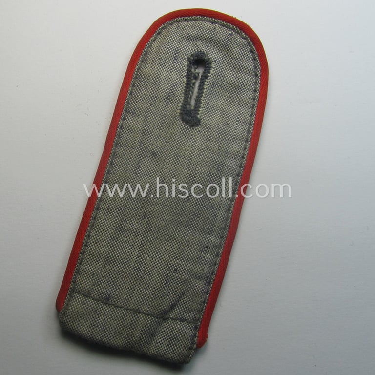 This is a neat - and actually not that often encountered, albeit regrettably single! - WH (Luftwaffe) enlisted-mens'-type: 'Flakartillerie'-shoulderstrap as piped in the bright-red (ie. 'hochroter') branchcolour and that was intended for a: 'Soldat Flak-Artillerie-Truppen' (or private who served within the anti-aircraft troops) as was specifically intended for the bluish-grey (ie. 'blaumelliertes') summer-shirts and that comes in an overall nice- (albeit moderately used- ie. worn-), condition. The strap - which measures approximately 10,8 cms. in length - is as stated 'piped' in the neat bright-red- (ie. 'hochroter'-) coloured branchcolour and has the (typical) 'silk-like'-type piping attached and was as such intended for a soldier that served within the: 'Flakartillerie-Truppen' (or: anti-aircraft troops). The piece comes naturally mounted onto its period tongue. It comes in a just moderately used ie. worn condition (it shows some minimal age- and/or staining) and is still a bit 'wrinkled'. Simply a nice - and truly not that often encountered! - WH (Luftwaffe) EM-type: 'Flakartillerie'-shoulderstrap!