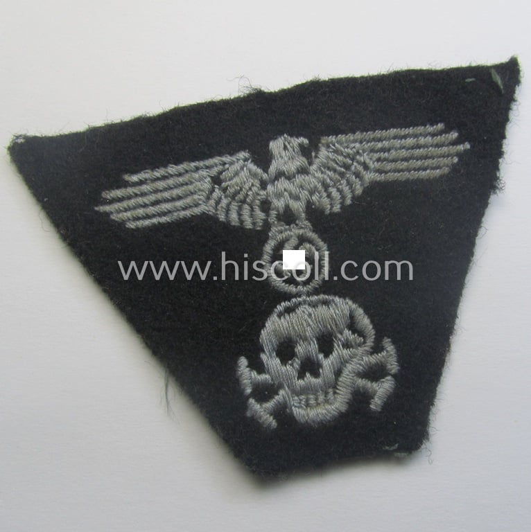 This is an attractive - and nowadays actually truly scarcely encountered! - somewhat crudely executed Waffen-SS black-coloured, M43-pattern 'Panzer'-cap-trapezoid (ie. 'Mützentrapez' aka “pirate-trap”) as was executed in machine-embroidered pattern as was specifically intended for usage on the (later-war-period) M43-model field-caps (ie. 'Einheitsfeldmützen') and that comes in a minimally used- and/or worn-, condition. The piece on offer here just shows some truly minimal age ie. staining simply caused by having been minimally used ie. having been stored as such for decades: it was once glued into an album and still shows some glue- ie. carton-remains on its back (as can be seen on the pictures). The trapezoid (that presumably originated from the so-called Dachau clothing-depots) originates from an insignia-lot that was brought to the USA by an US veteran and that remained there for years in a collection. Simply an attractive, Waffen-SS 'Panzer'-cap- ie. “pirate-type”-cap-trapezoid that can easily be used to restore a cap or to be stored in any cloth-insignia ie. Waffen-SS collection and that is I deem accordingly priced!