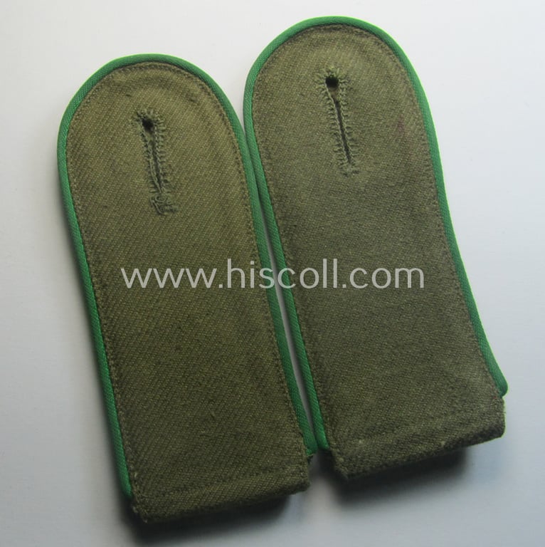 This is a truly attractive - fully matching and with certainty very rarely encountered! - pair of (I deem fairly early-pattern), WH (Heeres) 'tropical' (ie. truly DAK- or 'Deutsches Afrikakorps'!) related, enlisted-mens-type shoulderstraps as was piped in the neat darker-green- (ie. 'grüner'-) coloured branchcolour as was specifically intended for - and with certainty worn by! - a: 'Soldat der Jäger-Truppen' (or: simple soldier who served within an army mountain-troopers- ie. infantry-related regiment) and that comes in an overall very nice- (albeit moderately used- ie. worn-), condition. The neat shoulderstraps - which measure each approximately 11,5 cms. in length - have the neat darker-green- (ie. 'grüner'-) coloured and/or desirable 'silk-like'-type piping attached and come mounted onto their functional tongues as issued and/or most certainly worn. The straps come in a fully 'text-book' condition and have the 'greenish-brown'-coloured and/or linnen-based 'upperdecks'. The straps are also 'backed' with field-green-coloured wool, something that is more often encountered with early-period, genuine tropical ie. DAK- (or 'Deutsches Afrikakorps'-) related shoulderstraps. The straps are only minimally worn (they are just somewhat faded ie. slightly stained caused by regular usage) and comes in a truly great condition overall. They have never been cleaned and still show some dirt ie. staining as caused by years of storage and/or moderate wear. As most certainly known are most DAK-shoulderstraps offered on todays' market copies: this is naturally a fine and 100% genuine, period pair for which I give a life-time garuantee (as always). Simply a superb - and as most certainly known very rarely encountered! - tropical-pattern, 'Jäger'-related EM-type shoulderstrap-pair that is (I deem) priced according to its unmistaken rarity and/or desirabilty!