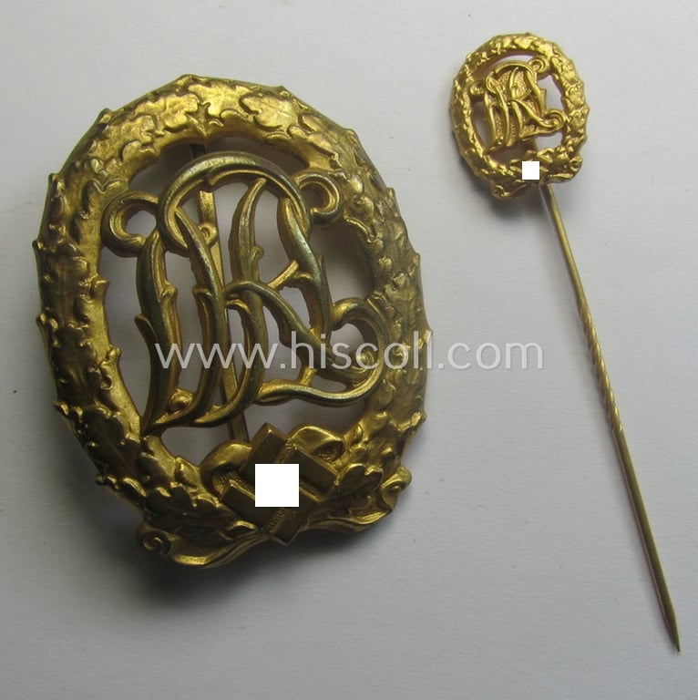 Superb, 'Reichssportabzeichen DRL in Gold' (or: golden-class DRL sports'-badge) being a maker- (ie. 'Wernstein - Jena'-) marked example and that comes with its accompanying miniature