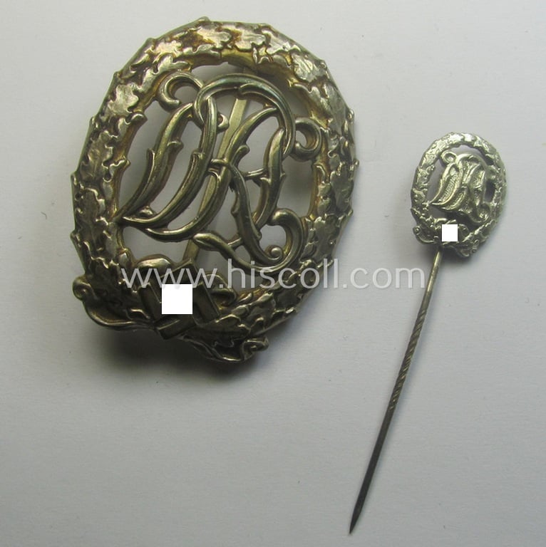 'Reichssportabzeichen DRL in Silber' (or: silver-class DRL sports'-badge) being a maker- (ie. 'Wernstein - Jena'-) marked example and that comes with its accompanying miniature