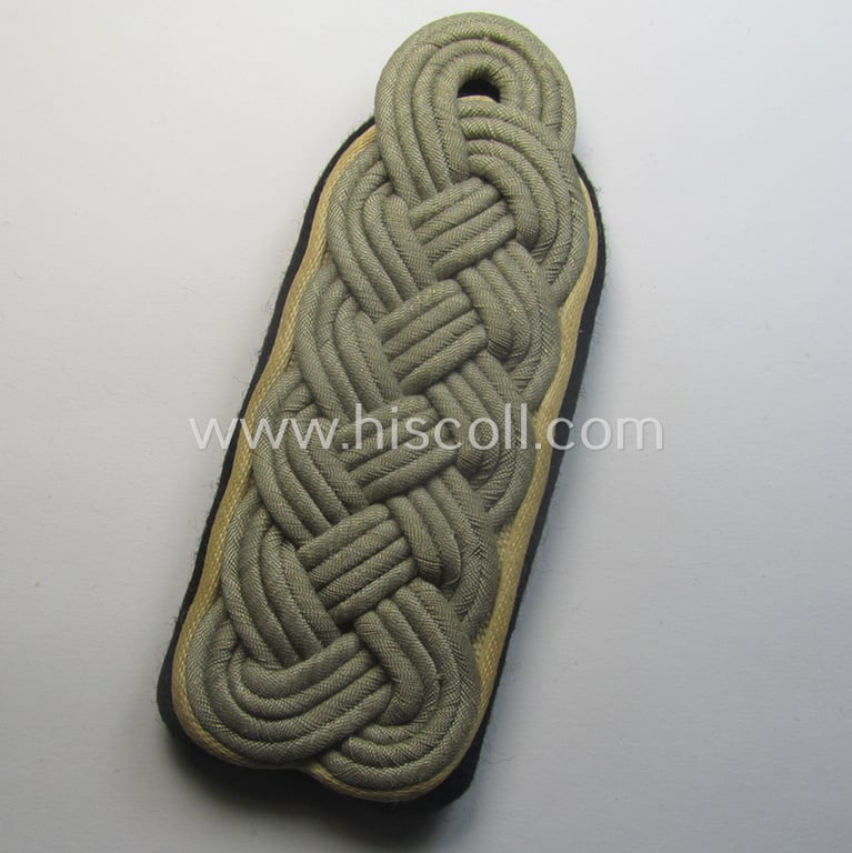 This is an attractive - albeit regrettably single! - Waffen-SS, officers'-pattern shoulderboard as piped in the white- (ie. 'weisser'-) coloured branchcolour as was intended for usage by an: 'SS-Sturmbannfuhrer' (or major) who served within the: 'Waffen-SS Infanterie-Truppen' (or: officer ie. infantry-major) and that comes in overall nice- (albeit moderately used ie. worn- and/or carefully tunic-removed-), condition. The neat shoulderboard - which came mounted onto its smaller-sized tongue - has a somewhat 'sub-dued'- (ie. greyish-silverish-coloured) 'upperdeck' and is executed in black-coloured wool. It shows the desirable 'silk-like'-type, white- (ie. 'weisser'-) coloured piping attached (as can be seen on the pictures). The board never had any pips nor 'cyphers' attached and measures approximately 10,3 cms. in length. The board has most certainly been worn as such and shows some moderate age, usage and/or minimal staining. I deem that I have priced this neat (and actually rarely found!) Waffen-SS-pattern, officers'-type 'Sturmbannführer'-shoulderboard, accordingly!