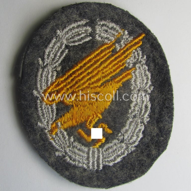 WH (Luftwaffe) 'Fallschirmschützen-Abzeichen in Stoff' (or: cloth-based paratroopers' jump-badge) that is nicely machine-embroidered and being of the so-called: 'padded version'