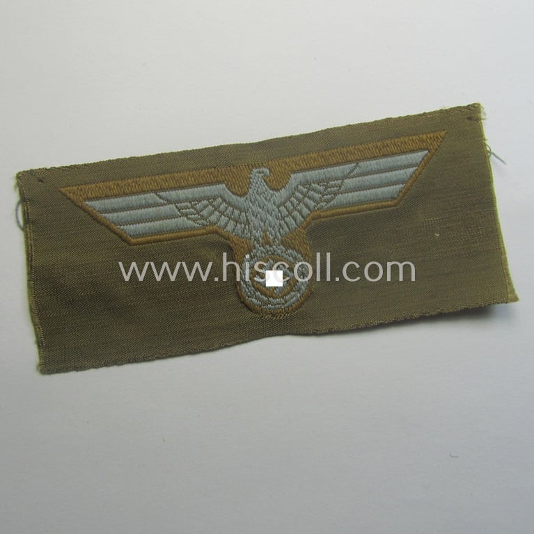The attractive example on offer here is neatly light-blue-coloured (as to be expected) and was executed onto a (typical) tropical-pattern, brownish- (ie. typical tan-) coloured and/or: linnen-based background as to be expected. The piece comes - as stated above - in a truly 'virtually mint- ie. unissued'- and/or never confectioned- nor folded, condition. The side-cap eagle (ie. 'Tropen-Mützenadler für Schiffchenmützen- o. Einheitsfeldmützen') is just a tiny bit stained ie. wrinkled caused by years of storage but has maintained very nice detail, overall. The piece can as such perfectly serve to restore any tropical 'Schiffchen' (or even: 'Einheitsfeldmütze'). These 'tropical-issue-' (ie. DAK- or 'Deutsches Afrika Korps'-related-) cap-eagles can noways easily be graded 'scarce' and come actually not that often offered for sale!