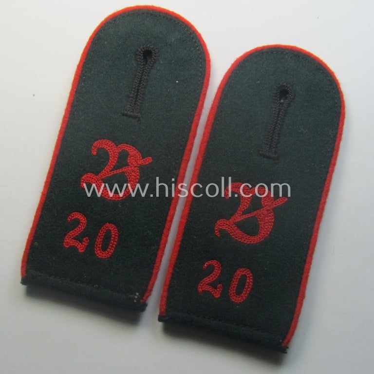 This is an attractive - fully matching and as such actually very scarcely encountered! - early- (ie. pre-war-) period WH (Heeres), 'M36'- (ie. 'M40'-) type (rounded-style) and neatly 'cyphered', enlisted-mens'-type shoulderstraps as piped in the bright-red- (ie. 'hochroterer'-) coloured branchcolour as was intended for - and with certainty worn by! - a: 'Soldat u. Mitglied des Art.-Beobachtungs-Abteilungs 20' (or: siimply soldier who served within a specific, artillery-observers' unit, numbered: '20') and that comes in an overall nice- (albeit moderately used and/or worn- ie. carefully tunic-removed-), condition. The neat shoulderstraps have a darker-green-coloured and (smooth) woolen-based 'upperdecks' as to be expected and show the bright-red- (ie. 'hochroterer'-) coloured and/or woolen-type piping attached (as can be seen on the pictures). The straps come mounted onto there period tongues and measure approx. 10 cms. in length and show the neat (machine-embroidered by means of so-called: 'Kurbelstickerei'), Gothic-styled: 'B'- and/or '20'-numerals (ie. cyphers or: 'Ziffern') attached which are executed in the bright-red- (ie. 'hochroter'-) coloured wool as to be expected. The straps show some minimal age and/or wear (some minor staining and/or dust is visible-/present). It should be noted that all 'cyphered'-type shoulderstraps can be easily regarded 'scarce'. Simply an attractive and/or early- (ie. pre-) war period, 'cyphered Heeres'-related shoulderstrap-pair as was intended for a: 'Soldat u. Mitglied des Art.-Beobachtungs-Abteilungs 20': I deem that I have priced this very attractive and neatly 'cyphered' pair, accordingly!