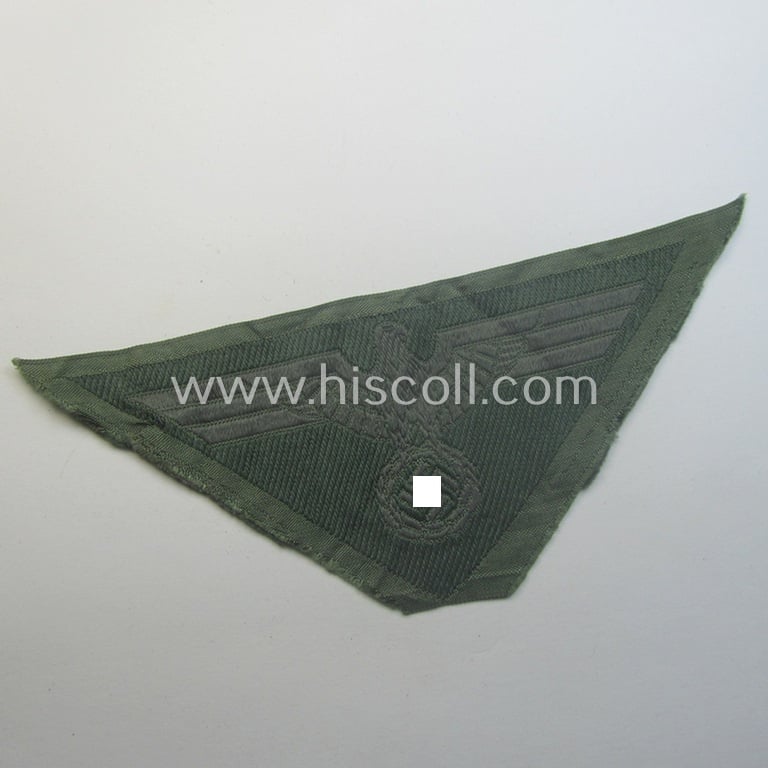 This is an attractive example of a (typical later-war-period) WH (Heeres) so-called: 'M44'-pattern- (and/or trapezoid-shaped) breasteagle (ie. 'Brustadler für Mannschaften u. Unteroffiziere des Heeres') being a field-grey-coloured example that is executed in the neat 'BeVo'-weave pattern and that is (as more often) void of an interwoven 'BeVo-Wuppertal'-makers'-designation and that comes in an overall very nice- (ie. I deem 'virtually mint'- and/or simply never tunic-attached-), condition. The piece - which is executed in field-grey- ie. greyish-coloured linnen - comes as 'straightly cut of the role' and will be hard to be upgraded (it just shows some minimal storage-age only). This was the 'standard'-issue WH breasteagle as was used on most (later-war and/or battle-dress shaped) 'M-44-model- tunics. The eagle comes of course in a fully unconfectioned condition and just bears some truly minimal staining and/or wrinkled appearance (as can be seen on the pictures). Simply a very nice example: great to restore any M44 army-tunic or ideally fitted to be stored in any eagle- ie. cloth-collection!