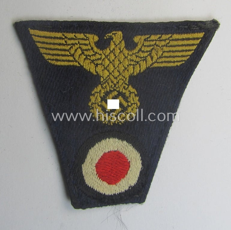This is a neat - and I deem moderately used and/or carefully cap-removed - example of a linnen-based, trapezoid-shaped side-cap- (ie. evt. M43-cap) eagle (ie. 'Mützentrapez') as executed in the so-called: 'BeVo'-weave-pattern as was specifically intended for an official of the: 'Deutsche Reichsbahn' and that comes in an overall nice- (ie. I deem just moderately used- ie. once cap-attached-), condition. These eagles - as woven in golden-yellow-coloured linnen on a darker-blue-coloured- (and also linnen-based) background were worn on the darker-blue-coloured side-caps (ie. evt. also M43-field-caps) of the various officials serving within this organisation. The piece - showing a left-facing eagle as to be expected - it is just a tiny bit stained ie. wrinkled as caused by decades of storage only. This piece originates from a larger collection of various RB- ('Reichsbahn'-) related eagles that was compiled over many years and that I recently acquired for the website. Simply a nice - and not that commonly encountered - 'Deutsche Reichsbahn'-related, trapezoid-shaped side-cap-eagle!