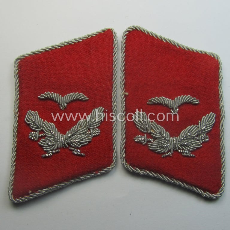 This is an attractive - fully matching and actually not that easily found! - pair of WH (Luftwaffe) officers'-type collar-patches (ie. 'Kragenspiegel für Offiziere der Luftwaffe') as was executed in the bright-red- (ie. 'hochroter'-) coloured and/or: typical smooth- (ie. 'moleskin'-) type wool as was specifically intended for usage by an officer holding the rank of a: 'Leutnant der Flak-Artillerie-Truppen' (or: air-force lieutnant who served within the anti-aircraft, artillery-troops) and that comes in an overall very nice- (ie. I deem just minimally used- and/or presumably carefully tunic-removed-), condition. The pair is neatly hand-embroidered and shows great detail and/or craftmenship (as can be seen on the pictures). Both pieces have a 'standard-type', yellowish-beige-coloured- and/or 'buckram'-based 'backing' and still show some minimal stitching-remains caused by having been once tunic-attached. Simply a truly attractive pair of LW officers'-type collar-tabs that is with certainty accordingly priced!