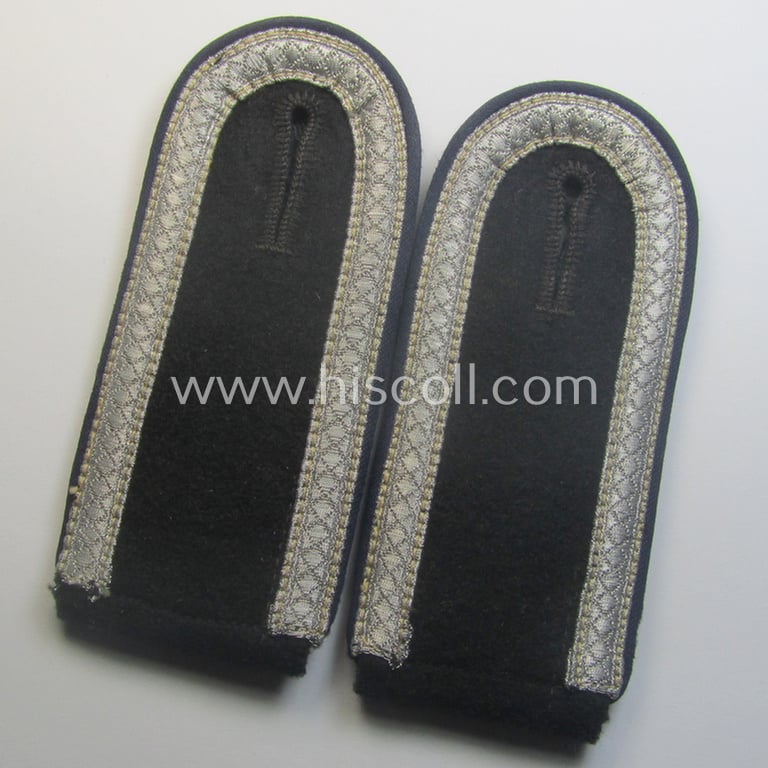 This is an attractive - fully matching and I deem just minimally worn! - pair of somewhat early-war-period (I deem around 1941) Waffen-SS, NCO-type shoulderstraps that shows the neat darker-blue- (ie. 'blauer'-) coloured branchcolour and/or typical 'silk-like'-type piping attached and was as such worn by an NCO holding the rank of: 'SS-Unterscharführer der Sanitäts-Truppen' (or: junior-sergeant ie. medical-orderly who served within the SS-medical-troops). The straps are in all facets fully 'text-book'-SS-NCO-straps and do show the minimal signs of having been used and/or worn as such. The shoulderstraps - that measure approx. 11 cms. sized in length each as more often encountered - show some minimal age simply caused by wear and/or usage. The straps shows the typical early-pattern (and/or: regular-shaped) tongues attached and do also show the field-grey-coloured 'underlays' (as can be noticed on the pictures). The pair shows the typical, silverish-grey-coloured (ie. non-sub-dued) NCO-braid period-attached denoting that they were used by an NCO holding the rank of: 'Unterscharführer' (or: junior-sergeant). It should be noted that these original, period Waffen-SS-shoulderstraps can nowadays easily be graded 'scarce': even more so when they are of the NCO-type and piped in the not that commonly encountered, blue-coloured- (ie. 'SS-Sanitäts-Truppen'-) related branchcolour. I deem that this attractive and textbook, fairly early-period Waffen-SS NCO-type shoulderstrap-pair is with certainty accordingly priced!
