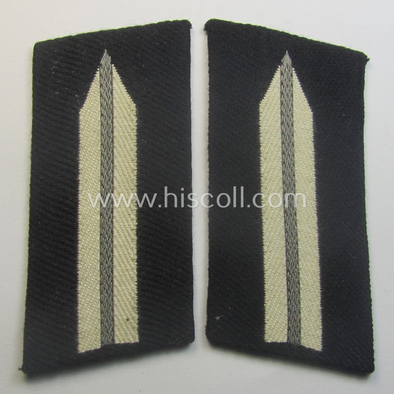 This is an attractive - fully matching and actually not that easily found! - pair of RAD (ie. 'Reichsarbeitsdienst') enlisted-mens-type collar-tabs (being of the second pattern as was used in the period between 1936-41) as was specifically intended for usage by a: 'RAD-Vormann' and that comes in an overall very nice- (ie. I deem simply never used- nor tunic-attached-), condition. The neat collar-tabs - which are nicely woven in a technique similar to the so-called 'BeVo'-weave pattern - are nicely 'backed' with typical carton-based material (as can be seen on the pictures). The tabs (which are as stated above fully matching) come in a very nice, ie. fully 'text-book'- and/or never tunic-attached condition. Simply a great occasion to acquire a desirable (and truly hard to find!) 'Reichsarbeitsdienst'-related, EM-type collar-tab-pair that was intended for usage by a: 'RAD-Vormann'!