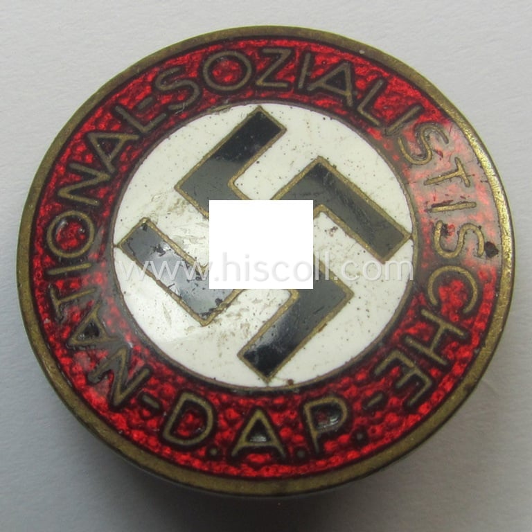 The attractive - truly rarely encountered and nicely preserved! - N.S.D.A.P.-membership-lapel-pin (ie. 'N.S.D.A.P.-Parteiabzeichen') - which has been just moderately used ie. worn - has a very nicely preserved age-patina and has most certainly never been cleaned nor polished: it is showing just minimal wear but is void of any (enamel)damage (as can be seen on the pictures): just some regular wear ie. minimal scratches are noticable. The badge shows the superimposed makers'-designation: 'RzM' and/or: 'M1/155' and is as such an example that was produced by the (rarely seen!) Austrian-based maker named: 'Schwertner & Cie.' as was based in the town of Eggenberg b. Graz. It shows, moreover, a somewhat tarnished- (ie. minimally stained) finish as can be seen from the pictures. This example - which has a somewhat bright-red-coloured- (ie. enamelled) area - comes mounted onto its regular-styled pin- ie. pin/catch-set-up which is naturally still fully functional and/or present (as can be seen on the pictures). I deem this an attractive 'N.S.D.A.P.'-membership-pin ie. party-badge (by a truly unusually found maker!) that is most certainly priced according to its obvious rarity and/or desirability!