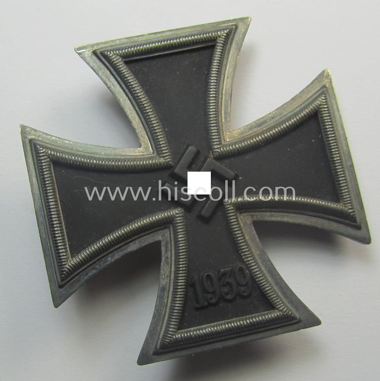 This is a truly attractive - albeit just moderately worn- ie. used - example of an: 'Eisernes Kreuz 1. Klasse' (or: Iron Cross 1st class) being an - I deem - fairly early-period- and/or clearly maker- (ie. 'L/50'-) marked example as was produced by the desirable maker (ie. 'Hersteller'): 'Gebrüder Godet' (ie. 'Hersteller L/50') and that comes as issued and/or recently found and that comes in an overall very nice- (albeit moderately used- and/or clearly worn-), condition. The magnetic (and typically non-vaulted) cross has an attractive (somewhat darkened) age-patina and retains truly great detail: the black-coloured core shows some minimal staining but is totally void of any paint-loss or alike (as can be noticed on the pictures). The cross has, however, lost its off-factory-applied polished sides (ie. 'hochpolierte Kanten'). The back of the cross is just minimally stained and dirty (but was never cleaned nor polished). The (straight-shaped) pin and typical catch (ie. set-up) are naturally unaltered and/or fully functional. The cross is I deem - as stated above - an early-period example that was produced by the maker 'Gebr. Godet' as based in the town of Berlin and that was never before in a collection. I deem that this attactive and most certainly desirable example is accordingly priced!