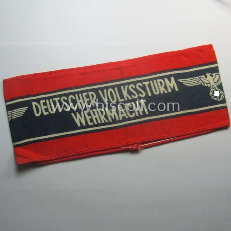 Typically printed- and/or later-war-period, bright-red- and/or black-coloured so-called: 'Deutscher Volkssturm'-armband (ie. 'Armbinde') that comes in an overall very nice- (I deem hardly used- nor worn- ie. 'virtually mint'-), condition