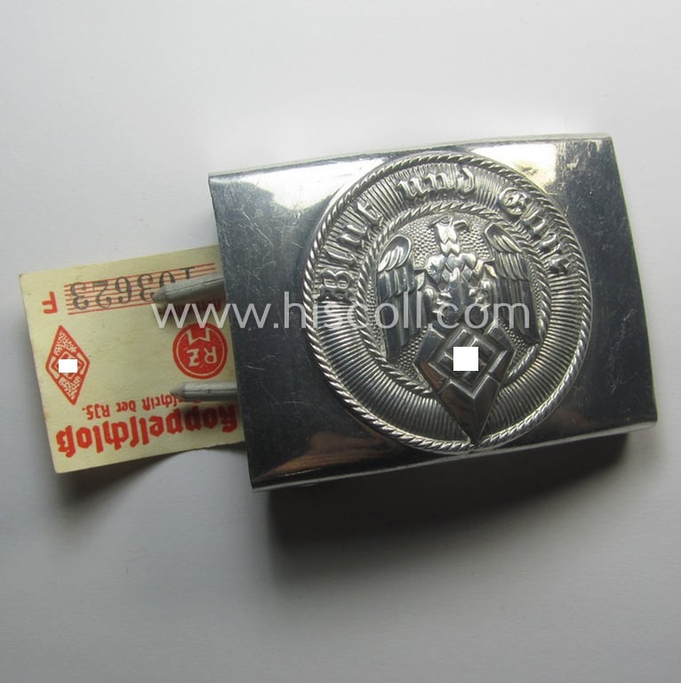 Superb - and virtually stonemint! - HJ (ie. 'Hitlerjugend') aluminium-based- (and/or unusually 'molded'-pattern!) belt-buckle being a maker- (ie. 'RzM M4/55'-) marked example that still retains its period 'RzM'-etiket