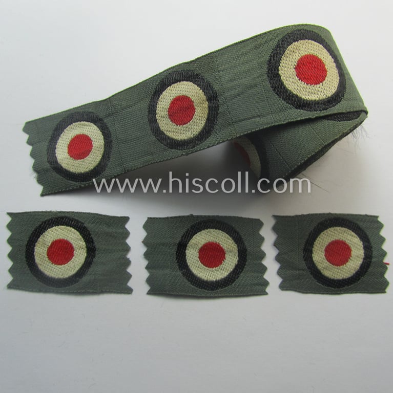 I recently uncovered a small 'role' holding 25 examples of the neat - simply never used and actually not that easily encountered! - WH (Heeres) 'standard-issue'-pattern side-cap-cocardes (ie. 'Kokarden für Schiffchen o. Einheitsfeldmütze') being all typical examples as executed in so-called: 'BeVo'-weave pattern and that come all in an overall very nice- (ie. simply never used- ie. still 'virtually mint'-), condition. The pieces were naturally never used nor pre-folded and come as 'straightly cut-of the role' (as can be seen on the pictures). It should be noted that these side-cap- (ie. 'Schiffchen'-) insignia-pieces are nowadays quite difficult to encounter. The pieces - which are executed in the so-called: 'BeVo'-weave pattern and that are executed in multi-coloured linnen onto a field-grey-coloured- and/or also linnen-based background - show some minimal storage-age only but can, nevertheless, excellently be used to complete or restore any side-cap (ie. 'Schiffchen'). My asking-price is naturally intended per single exampled. Simply a nice occasion to acquire an attractive 'Heeres'-related side-cap insignia-piece for a competitive price!