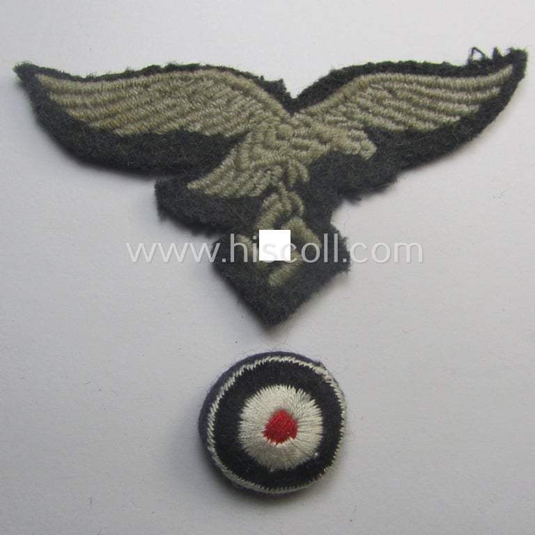 This is an attractive - I deem clearly used and/or cap-removed - so-called: WH (Luftwaffe) 'standard-issue'-pattern cap-eagle and cocarde-set (or: 'Effektensatz für das Luftwaffen-Schiffchen o. Einheitsfeldmütze') as was specifically intended for usage onto the LW side-caps or M43-fieldcaps and that comes in an overall nice- (and I deem just minimally used- ie. I deem once-(side-)cap-attached-), condition. Both pieces are just a tiny bit wrinkled and/or minimally stained (as can be seen on the pictures). Simply a neat LW cap-insignia-set that is I deem accordingly priced!