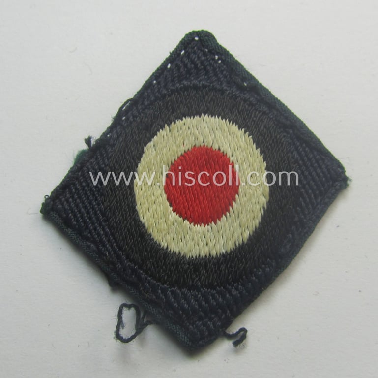 This is an attractive - and nowadays actually scarcely encountered! - WH (Kriegsmarine) 'standard-issue'-pattern side-cap-cocarde (ie. 'Kokarde für Schiffchenmütze') being an example as executed in so-called: 'BeVo'-weave pattern and that comes in an overall nice- (ie. truly used- and/or carefully side-cap-removed-), condition. It should be noted that these naval side-cap- (ie. 'Schiffchen'-) insignia-pieces are quite difficult to encounter (and come hardly ever for sale). The piece - which is executed in the so-called: 'BeVo'-weave pattern and is executed in multi-coloured linnen onto a darker-blue-coloured- and/or also linnen-based background: it was carefully confectioned and/or pre-folded and shows the signs of having been once cap-attached (as can be seen on the pictures). The piece shows some minimal age and/or staining but can, nevertheless, excellently be used to complete or restore any blue-coloured side-cap (ie. 'Kriegsmarine-Schiffchen'). Simply an attractive 'Kriegsmarine'-related side-cap insignia-piece that is actually hard to encounter and that is I deem accordingly priced!