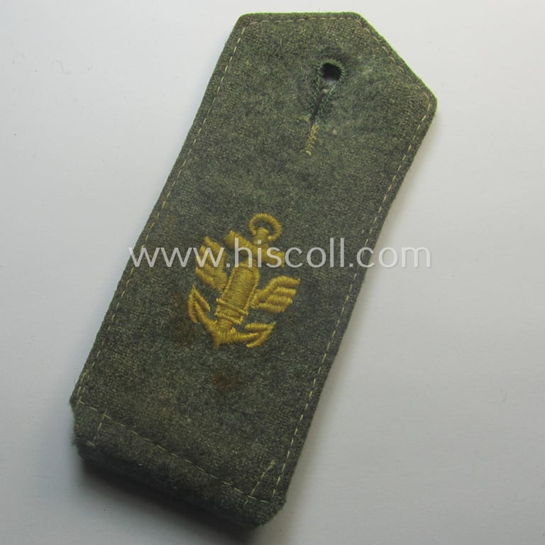 This is an attractive - albeit regrettably single! - 'cyphered'- (and I deem somewhat early- ie. mid-war-period pattern) enlisted-mens'-type shoulderstrap as was specifically intended for usage on the field-grey coloured navy-style tunics by a: 'Soldat eines Küsten-Artillerie-Regiments o. Abteilungs' (or: simple soldier who served within a naval, coastal-artillery unit) and that comes in an overall nice- (albeit slightly used ie. worn- and/or carefully 'cut-off-a tunic'-), condition. The strap - which is fully 'text-book' in all facets and that measures approximately 11cms. in length (and that has an approximate width of 4,7 cms. as more often observed) has a field-grey-coloured- and/or woolen-based 'upperdeck' and comes without tongue (it was carefully 'cut-off-a tunic'). The strap shows the neat interwoven 'winged shell'-cypher (ie. 'Ziffer') which is executed in golden-yellow-coloured linnen denoting the rank of a simple: 'Soldat'. The strap - shows some minimal age and/or wear (as can be noticed on the pictures). It should be noted that ALL 'Küsten-Artillerie' insignia-pieces are actually quite hard to encounter: those 'cyphered' examples even more so. Simply an attractive, neatly 'cyphered' naval EM-type shoulderstrap that was intended for usage onto the field-grey-coloured attire: too bad it is only a single specimen!