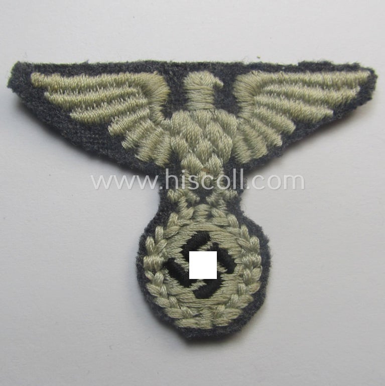 This is a neat - and actually scarcely encountered! - example of a: 'Deutsches Luftsport Verband'- (ie. DLV-) related- and nicely machine-embroidered cap-eagle as was specifically intended for usage onto the DLV-side-caps (ie. 'Schiffchenmützen') and that comes in an overall nice- (and I deem used- ie. once side-cap-attached-), condition. The DLV was an in the year 1933 formed organisation and was Germany's first move to establish the (later formed) airforce, the 'Luftwaffe'. The eagle is neatly machine-embroidered in greyish-white-coloured linnen onto a bright bluish-grey-coloured- (and/or woolen-based) background. Simply an attractive - and actually scarcely encountered! - 'DLV'-related 'Schiffchenadler' that comes not that often for sale!