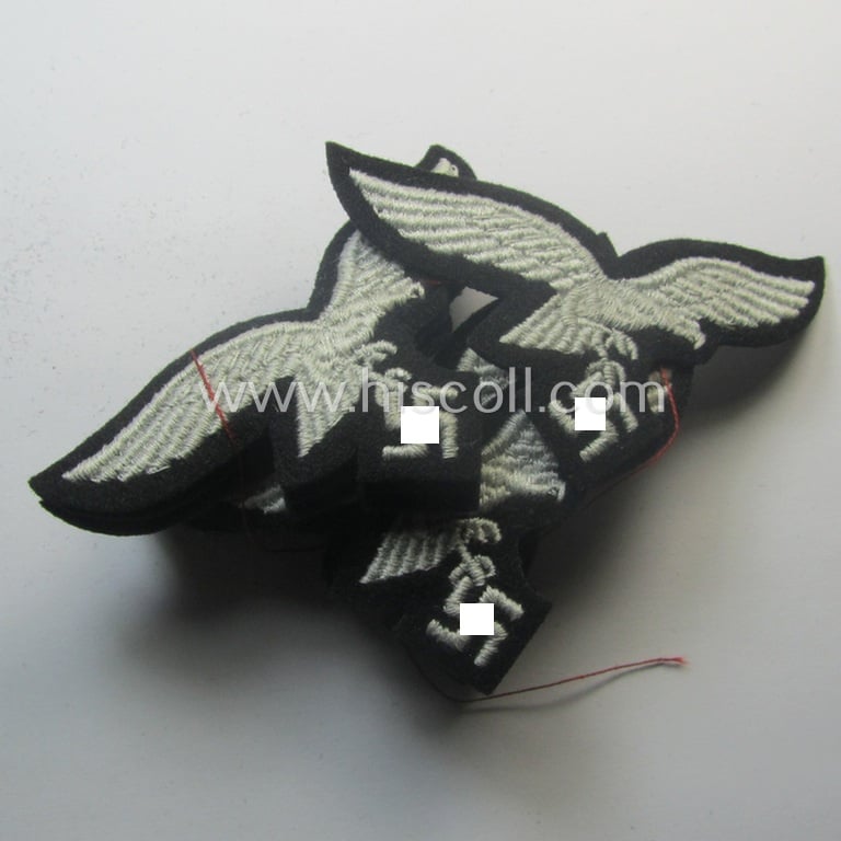 I recently uncovered a complete - and fully untouched! - 'bundle' holding ten - fully identical! - examples of the WH (Luftwaffe) cap-eagle (ie. 'Mützenadler für Schiffchen o. Einheitsfeldmütze') being all ten pieces, 'standard-issue'-pattern- and neatly machine-embroidered examples that are executed onto a black-coloured- and/or woolen-based background and that were as such intended for usage on the black-coloured 'HBT'-based work- (ie. regular black-woolen-based) 'Hermann Göring-Division'-related side-caps (ie. 'Schiffchen') all ten pieces coming in a 'virtually mint- ie. unissued' and/or simply never cap-attached, condition. The pieces have great pronounced detail and can naturally easily be used to restore or complete any black-coloured 'Luftwaffe'-side-cap (or even 'M43'-type field-cap ie. 'Einheitsfeldmütze'). My asking-price is naturally intended per single specimen. Simply a nice occasion to acquire a desirable LW cap-eagle for a very competive price!
