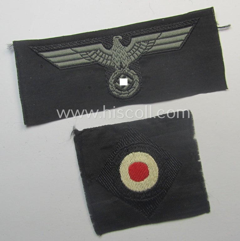 Mid-war-period, WH (Heeres) 'Panzer' cap-eagle & cocarde-set (ie. 'Schiffchenmützen-Adler u. Kokarde-Satz für Mannschaften u. Uffz.') being a 'virtually mint' set as executed in bluish-grey-coloured linnen onto a black-coloured background