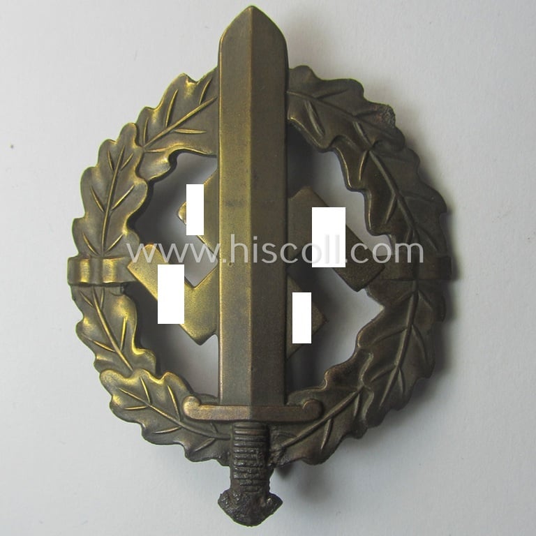 The attractive - and I deem fairly early- (ie. pre-) war-period - so-called: 'SA Sportabzeichen in Bronze' (or: bronze-class SA-sports-badge) is as stated nicely maker-marked on its back with the makers'-designation: 'E. Schneider' as based in the town of Lüdenscheid and also bears the (with pieces by this maker) usually encountered stamped-inscription that reads: 'Eigentum d. SA Sportabz. Hauptstelle' (on the back of the sword as is more often seen). The badge - which comes naturally mounted onto its functional (and fully unaltered) pin- (ie. catch-) set-up - just shows moderate usage and/or wear and was - I deem - never cleaned nor polished: it truly retains most (ie. all!) of its original (and somewhat darker-toned) bronze-coloured-finish which is nicely preserved over the years (as can be seen on the pictures). The badge is just a tiny bit stained ie. dirty caused by moderate wear and/or storage for decades. Simply an attractive, fairly early-period- and/or: neatly 'serial-numbered'-example of the bronze-class SA-sports-badge that is I deem accordingly priced!