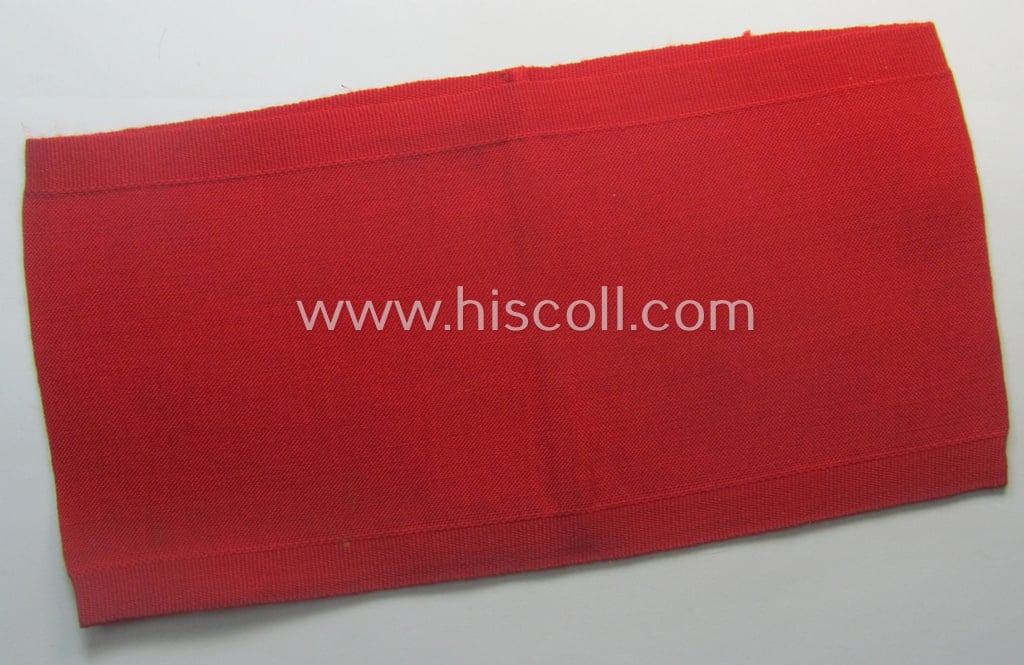 This is an attractive - and with certainty scarcely encountered! - bright-red-coloured- and EM- (ie. NCO-) pattern, so-called: 'Reichsluftschutzbund' (ie. 'RLB'-) service-armband (ie. 'Dienst-Armbinde') that is executed in the neat 'BeVo'-weave-pattern on a bright-red-toned background as was specifically intended for usage by a member serving within the: 'RLB-Werkluftschutz' (or: or factory-protection-service) and that comes in an overall very nice- (ie. 'virtually mint- ie. unissued'- and simply never tunic-attached-), condition. These attractive armbands were worn on the various blue-coloured RLB- (ie. eventually WLS- ie. 'Werk-Luftschutz'-related) tunics throughout the war. The nicely detailed armband on offer here - which shows the neatly interwoven 'borders' - measures folded approximately 40 x 10,4 cms. - simply shows no wear nor damage whatsoever: it just shows some minimal staining ie. storage-age only (as can be seen on the pictures). Simply an attractive - and with certainty scarcely encountered! - 'Reichsluftschutzbund' (ie. 'RLB'-) service-armband as was specifically intended for usage by the members serving within the: 'RLB-Werkluftschutz'!
