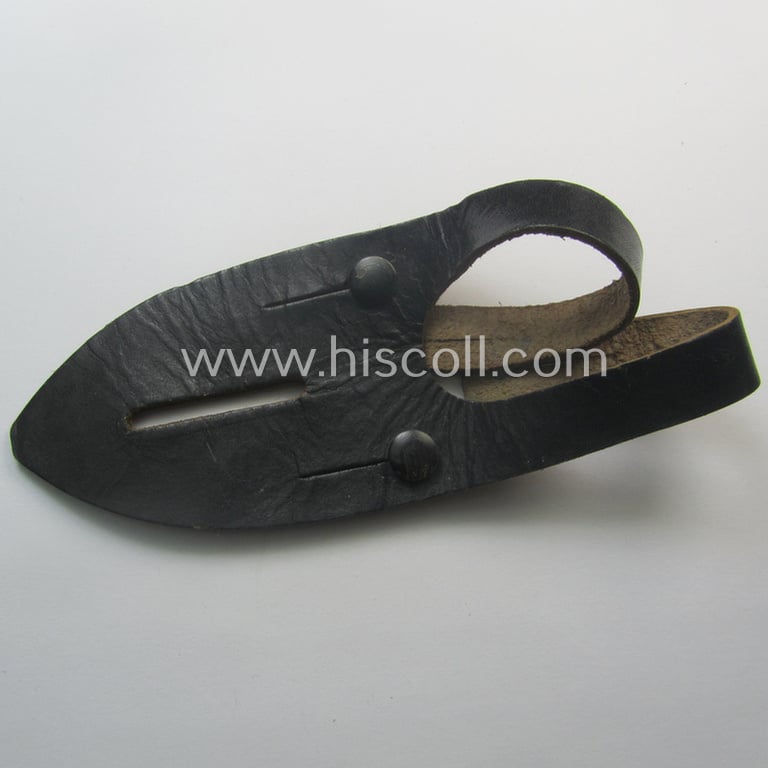 This is a little piece of WH-equipment that is often missing in a WH soldiers'- ie. equipment set-up: a 'standard-issue'-pattern, WH binoculars (ie. 'Dienstglas 6 x 30 o. 10 x 50') so-called: 'anti-movement flap' (or: 'Tragelasche für Dienstgläser') as was executed in black-coloured leather being a non-maker-marked example that comes in an overall very nice- (albeit moderately used- ie. worn-), condition. The neat piece is - as stated above - just moderately used and does show some regular traces of wear: the piece is, however, totally undamaged and fully souple: it comes thus in a still fully functional condition. The flap comes with both its two, original black-coloured- (and metal-based) 'studs' in place and can as such easily be re-mounted to any binocular-pair. Simply a neat little piece of WH-equipment that would surely look great if re-mounted onto a pair of 6 x 30 (or even a: 10 x 50-type) binoculars: without doubt a nice example of a fairly hard to find WH equipment-piece!