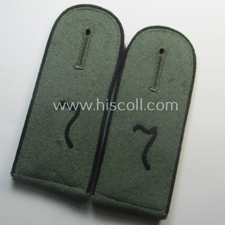 This is an attractive - fully matching and actually rarely encountered! - pair of (I deem) very early- (ie. 'Reichswehr'-) period, 'cyphered' WH (Heeres) enlisted-mens'-type shoulderstraps as was piped in the black- (ie. 'schwarzer'-) coloured branchcolour as was specifically intended for usage by a: 'Soldat des Pionier-Bataillons 7' (or: simple soldier who served within the army-engineers-battalion, numbered: '7') and that comes in an overall nice- (albeit clearly used- and/or worn-), condition. The straps - which measure 11,1 cms. in length each - are fully 'text-book' in all facets and are executed in the ('Reichwehr'-era type-) smooth-type wool, having the black- (ie. 'schwarzer'-) coloured (and woolen-type) piping attached (as can be noticed on the pictures). Both straps show some honest - albeit fair - wear and/or age: some staining and/or wear is present and noticable. Both shoulderstraps show the neat (machine-embroidered by means of so-called: 'Kurbelstickerei') '7'- numerals (ie. 'Ziffern') which are executed in the black- (ie. 'schwarzer'-) coloured wool as to be expected. The straps come mounted onto their functional tongues. Simply an attractive - and with certainty rarely encountered! - 'cyphered' shoulderstrap-pair that belonged to a: 'Soldat des Pionier-Bataillons 7': only the first such rare shoulderstrap-pair in this enigineer-related branchcolour I ever had on offer!
