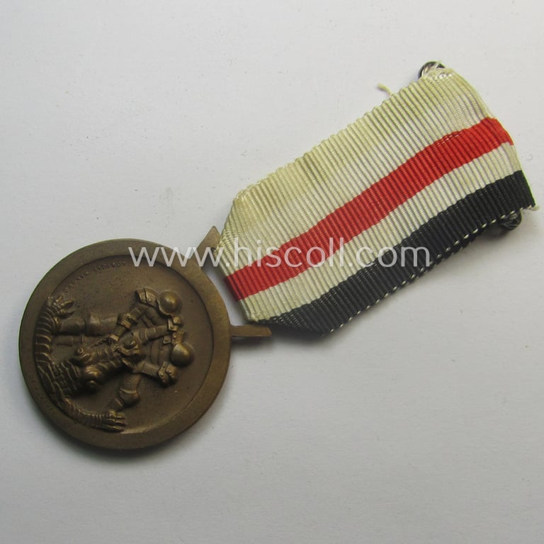 The attractive - and I deem most certainly early-period! - medal is stamped by the designer ie. cutter (named: 'De Marohis') and is also neatly maker- (ie. 'Lorioli-Milano'-) marked as is always the case with these neat and desirable, foreign commemorative awards. The pronounced medal retains most (ie. all!) of its minimally darkened, (reddish) golden-bronze-coloured finish and has simply never been cleaned nor polished: it is just a tiny bit dirty and retains truly fantastic and/or pronounced detail. The piece comes - as stated above - mounted onto its (regular-sized- and/or neatly folded ie. confectioned-) piece of original (and clearly faded!) ribbon (which is actually hard to find in itself). The ribbon - that also retains its chrome-toned safety-pin as worn - is as stated somewhat faded by usage and/or years of storage (as is more often the case). The medal originates from a German private-household and was never before in collectors'-hands. Simply a very attractive example of this desirable award: one of the best such examples I had on offer for quite some time!