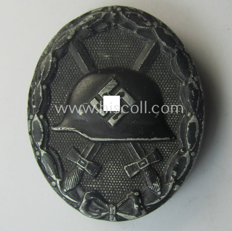 The attractive - and I deem just moderately used- and/or worn - black-class wound-badge (ie. 'Verwundeten-Abzeichen in Schwarz') truly retains a fair bit of its original, black-coloured- and/or somewhat 'matted'- (ie. satn-like-) finish: it only shows moderate wear and was simply nicely preserved over the years. The (non-magnetic!) wound-badge is - as stated above - neatly maker-marked with the makers'-designation that reads: 'E.S.P.' which stands for: 'E. Schmidthäußler - Pforzheim' (as is clearly visible on the back of the badge as can be seen on the pictures) signifying that it deals with a piece that was produced by the company 'E.S.P.'. Of course, are the (regular- ie. thin-shaped- and/or also non-magnetic) pin and/or: (typical) catch (-set-up) fully functional and of course present. This piece also shows a period engraved 'T'-character on its back (being most certainly the initial of the recipient). This piece has never been cleaned nor polished: it shows some obvious dust and/or minimal staining as to be expected.