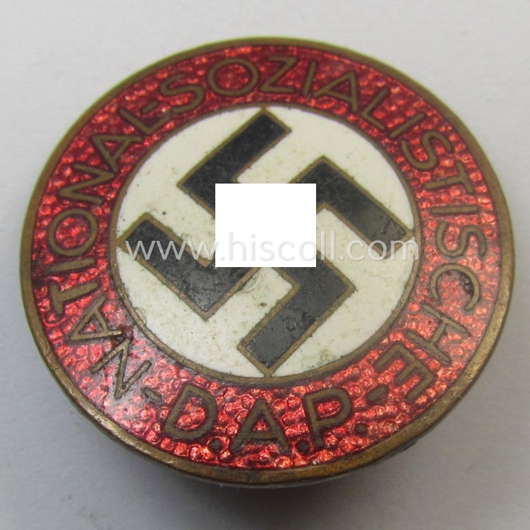 The attractive - fairly rarely encountered and nicely preserved! - N.S.D.A.P.-membership-lapel-pin (ie. 'N.S.D.A.P.-Parteiabzeichen') - which has been just moderately used ie. worn - has a nicely preserved age-patina and has most certainly never been cleaned nor polished: it is showing just minimal wear and regrettablt does show some minimal (enamel)damaged area in the middle of the swastika (as can be seen on the pictures): moreover, is some regular wear ie. are minimal scratches noticable. The badge shows the superimposed makers'-designation: 'RzM' and/or: 'M1/6' and is as such an example that was produced by the (fairly rarely seen!) maker named: 'Karl Hensler' as was based in the town of Pforzheim. It shows, moreover, a somewhat tarnished- (ie. minimally stained) finish as can be seen from the pictures. This example - which has a somewhat bright-red-coloured- (ie. enamelled) area - comes mounted onto its regular-styled pin- ie. pin/catch-set-up which is naturally still fully functional and/or present (as can be seen on the pictures). I deem this an attractive 'N.S.D.A.P.'-membership-pin ie. party-badge (by a fairly unusally found maker!) that is most certainly priced according to its obvious scarcity and/or desirability!