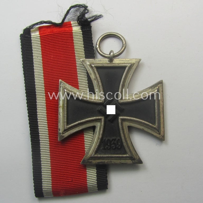 The attractive - and most certainly desirable! - 'Eisernes Kreuz II. Kl.'-set on offer here - which was surely issued but that was I deem never worn nor even mounted - came together with its folded and non-confectioned (and approx. 29 cms. long-sized) ribbon (ie. 'Bandabschnitt') as found. The cross - which shows a clear makers'-designation ('106') stamped into its ring - was with certainty never cleaned and has an attractive age-patina: it retains, however, a fair bit of its so-called: 'hochpolierte Kanten' (or: polished sides) and has a minimally darkened- (ie. somewhat stained) finish (as can be seen on the pictures). The cross has a nicely preserved, black-finished (ie. somewhat 'satin-like'- ie. matted-) core: it is totally void of any damage nor paint-loss (as can be seen on the pictures). The piece is just a tiny bit dusty and/or stained but was never cleaned nor polished. The cross is an evident (and magnetic!) specimen that was produced by the desirable Austrian based maker, named: 'Brüder Schneider A.G.' as was based in the town of Wien VI/56 (ie. 'Hersteller 106'). The cross has very nice and/or pronounced detail as to be expected for a cross by this desirable maker. This neat IC was recently found at a German private-household and was never before in collectors'-hands. Simply an attractive 'EK II. Klasse' by a desirable maker that is most certainly accordingly priced!
