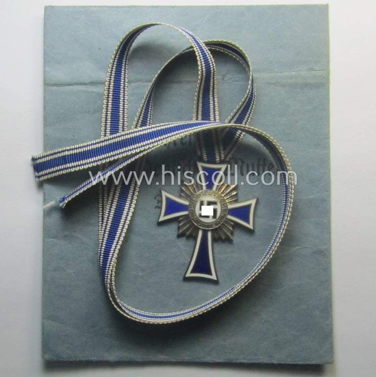 'Ehrenkreuz der deutschen Mutter - zweite Stufe' (or: silver-class mothers'-cross) that came mounted onto its long-sized ribbon and that came stored in its period pouch by the maker: 'Moriz Hausch A.-G. - Pforzheim'