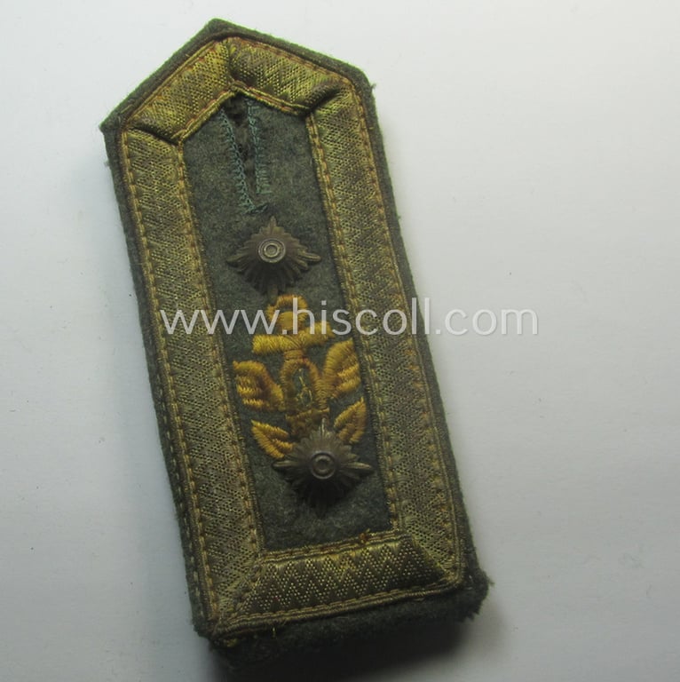 This is an attractive - albeit regrettably single but nevertheless not that often seen! - 'cyphered'- (and I deem typically early- ie. mid-war-period-pattern) NCO-type shoulderstrap as was specifically intended for usage on the field-grey coloured navy-style tunics by an NCO holding the rank of an: 'Oberfeldwebel eines Küsten-Artillerie-Regiments' (or: sergeant first-class serving within a naval, coastal-artillery unit) and that comes in an overall nice- (albeit moderately used ie. worn-), condition. The strap - which is fully 'text-book' in all facets and that measures approximately 11,8 cms. in length (and has a width of 5,2 cms. as usually seen) has a field-grey-coloured- and/or woolen-based 'upperdeck' and comes mounted onto its functional tongue. The strap shows the typical (golden-toned, somewhat broader-shaped) KM-pattern NCO-braid attached and shows a neat interwoven 'winged shell'-cypher (as executed in golden-yellow-coloured linnen) and a pair of (tarnished golden-toned, smaller-sized, zinc-based) pips attached denoting the NCOs rank of an: 'Oberfeldwebel'. The strap shows some moderate age and/or wear (as can be seen on the pictures). It should be noted that ALL 'Küsten-Artillerie' insignia-pieces are actually quite hard to encounter: those 'cyphered' examples even more so, which grades them easily as 'scarce'. Simply an attractive, neatly 'cyphered' naval NCO-type shoulderstrap that was intended for usage on the field-grey-coloured attire: too bad it is only a single example!