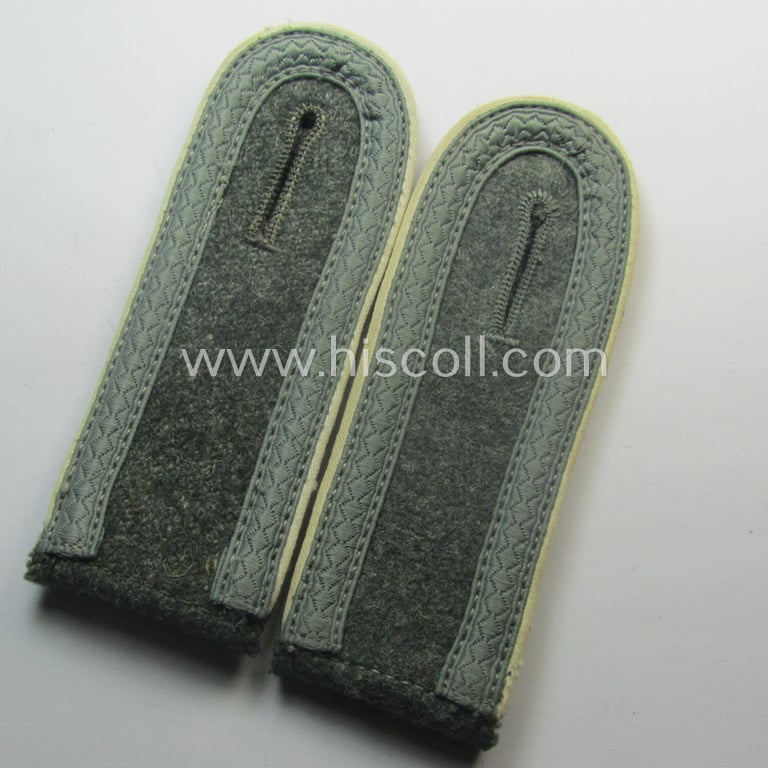 This is a truly attractive - fully matching and actually quite scarcely found! - pair of WH (Heeres) early- (ie. mid-) war-period, so-called: 'M41- o. M43'-pattern, NCO-type shoulderstraps having the neat white- (ie. 'weisser'-) coloured branchcolour as was intended for - and clearly worn by! - an: 'Unteroffizier eines Infanterie-Regiments' (or: NCO ie. junior-sergeant who served within an army-infantry-regiment) and that comes in an overall very nice- (albeit just moderately used ie. worn-), condition. The neat shoulderstraps - which measure approximately 11 cms. in length each - have the 'standard-type'- and/or field-grey-coloured, woolen-based 'upperdecks'. The straps - which have the neat white- (ie. 'weisser'-) coloured and/or desirable 'silk-like'-type piping attached - show the (typical) bluish-grey-coloured (ie. 'sub-dued') NCO-braid attached denoting the rank ie. function of an: 'Unteroffizier' (or: junior-sergeant). The straps - which came mounted onto their functional tongues - show as stated above some moderate usage and/or wear (some minor staining and/or dust is visible and/or present). This neat pair originates from a private-household in Germany and was never before in collector-hands. Simply an attractive and/or: early- ie. mid-war-period, 'Heeres'-related NCO-type shoulderstrap-pair that was intended for usage by an: 'Unteroffizier eines Infanterie-Regiments'!